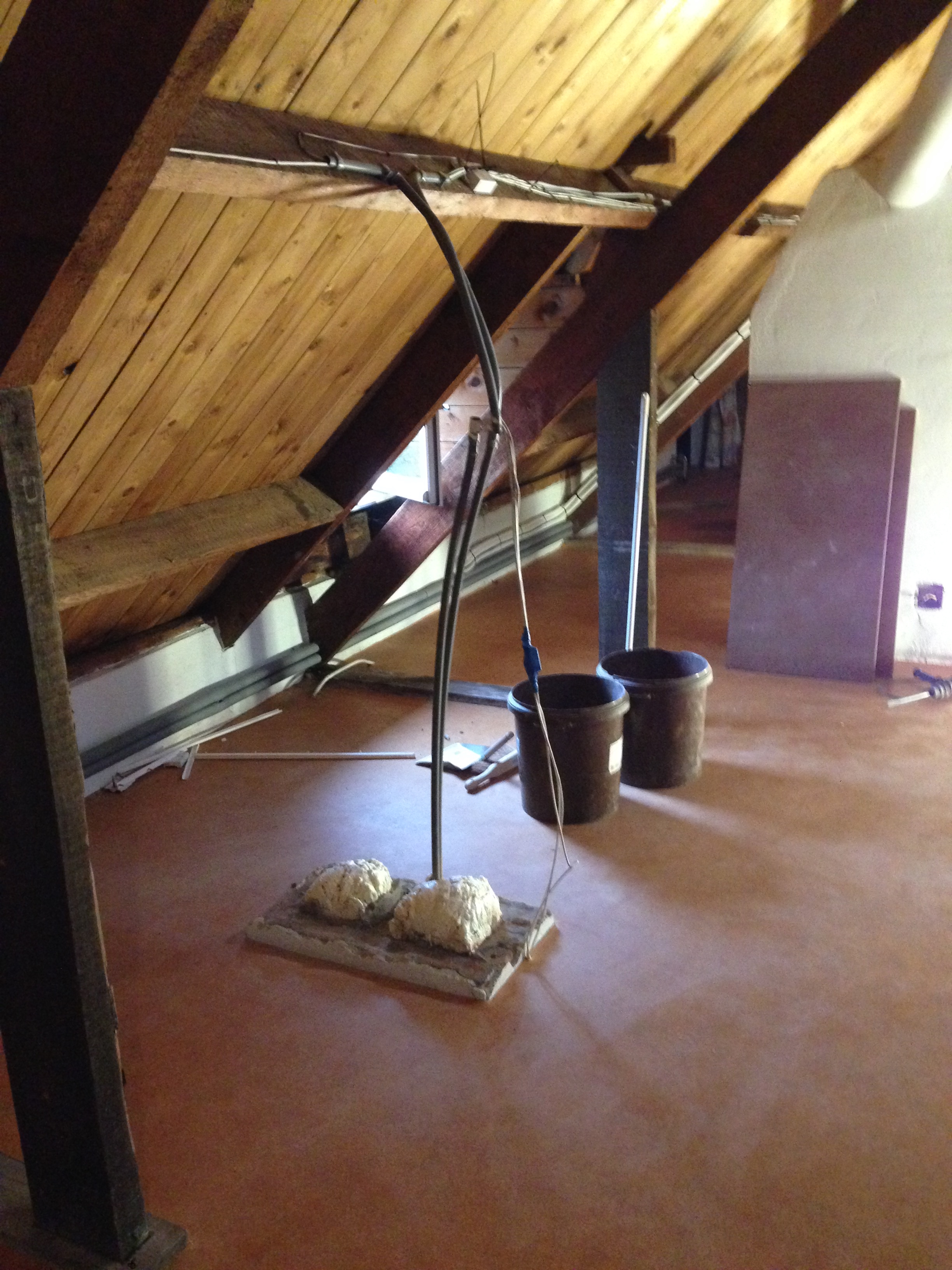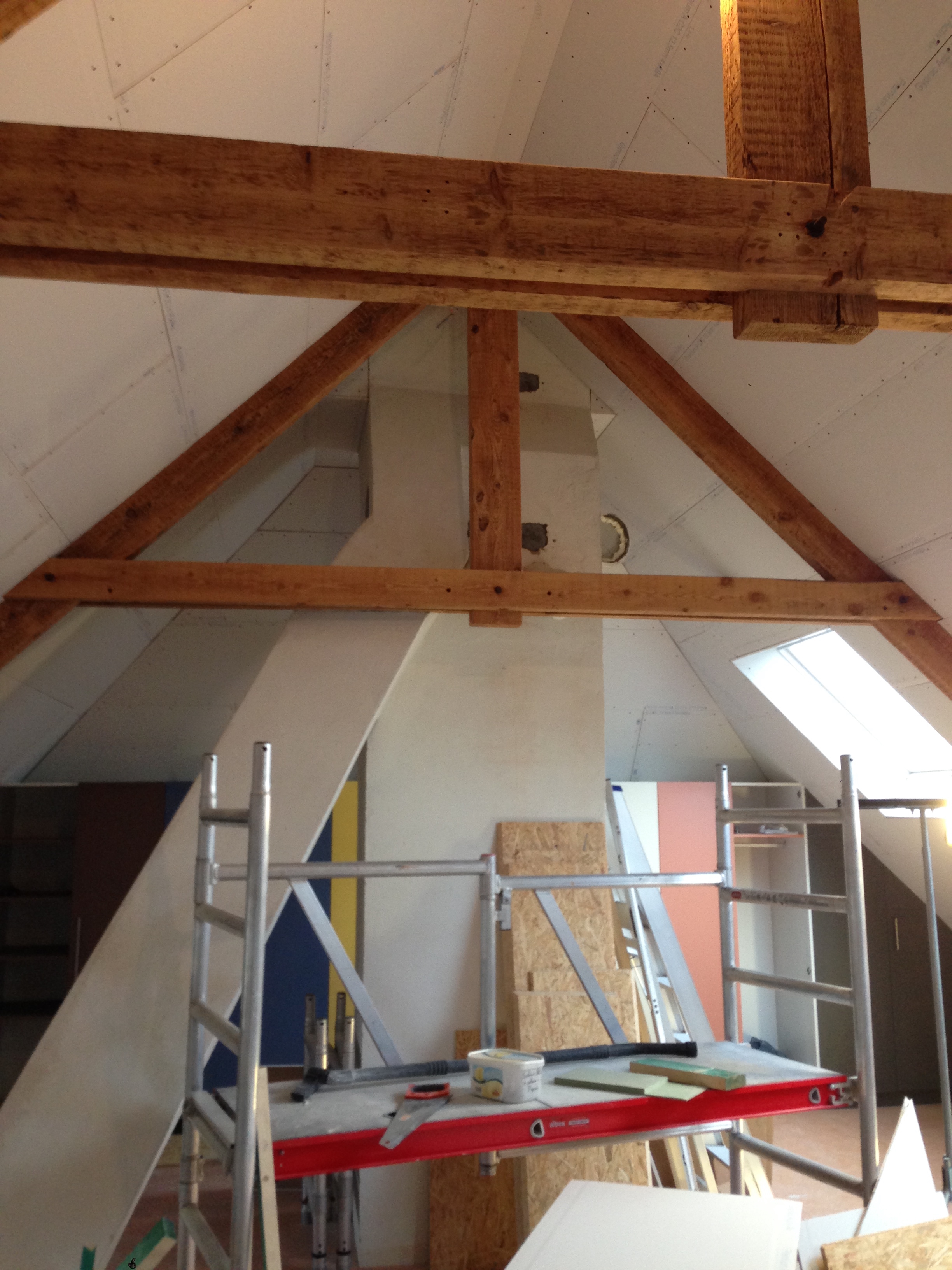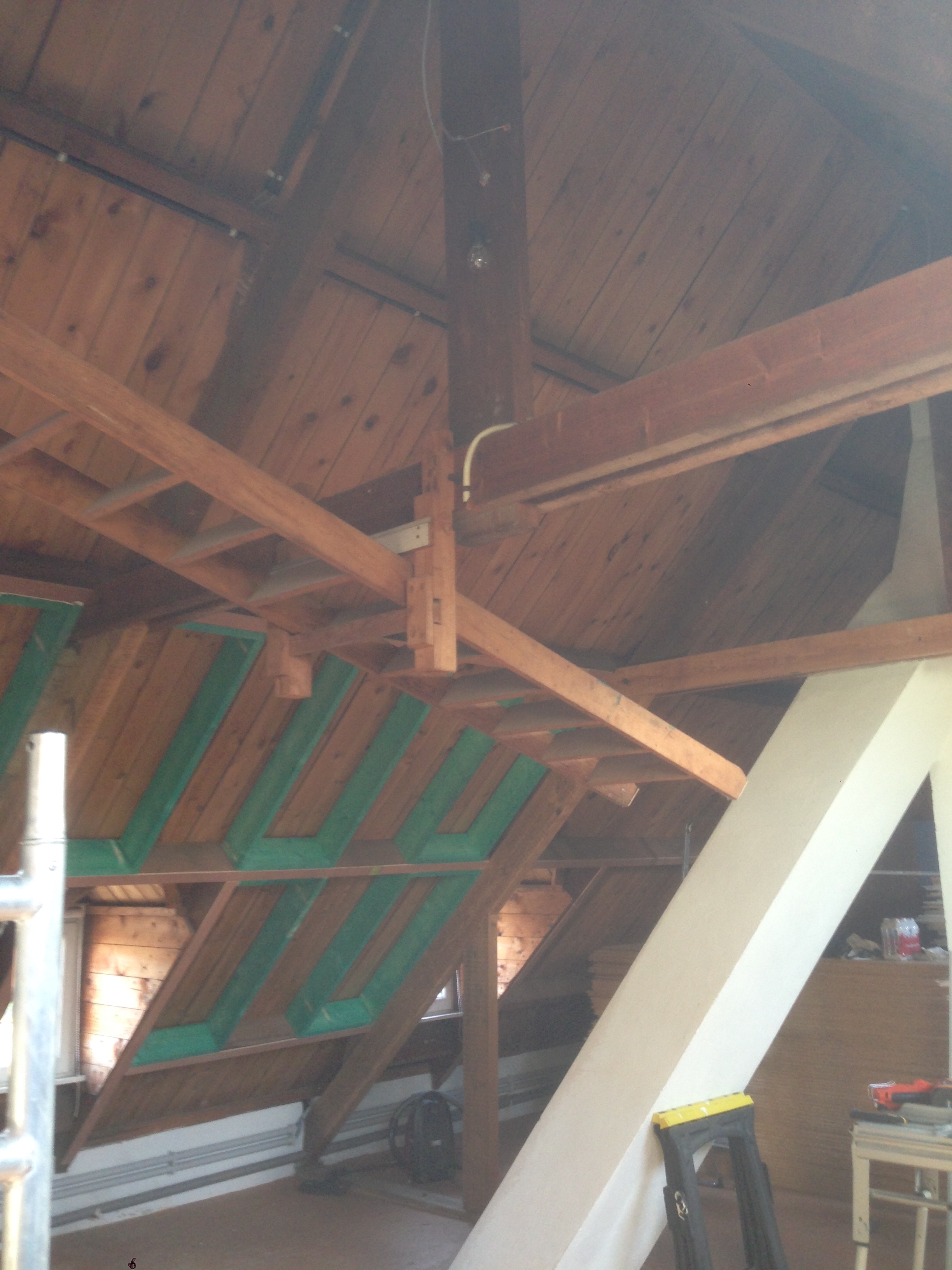 Zolder langs binnen uit voorzien van extra spanten om de 18 cm dikke isolatie tussen te plaatsen.