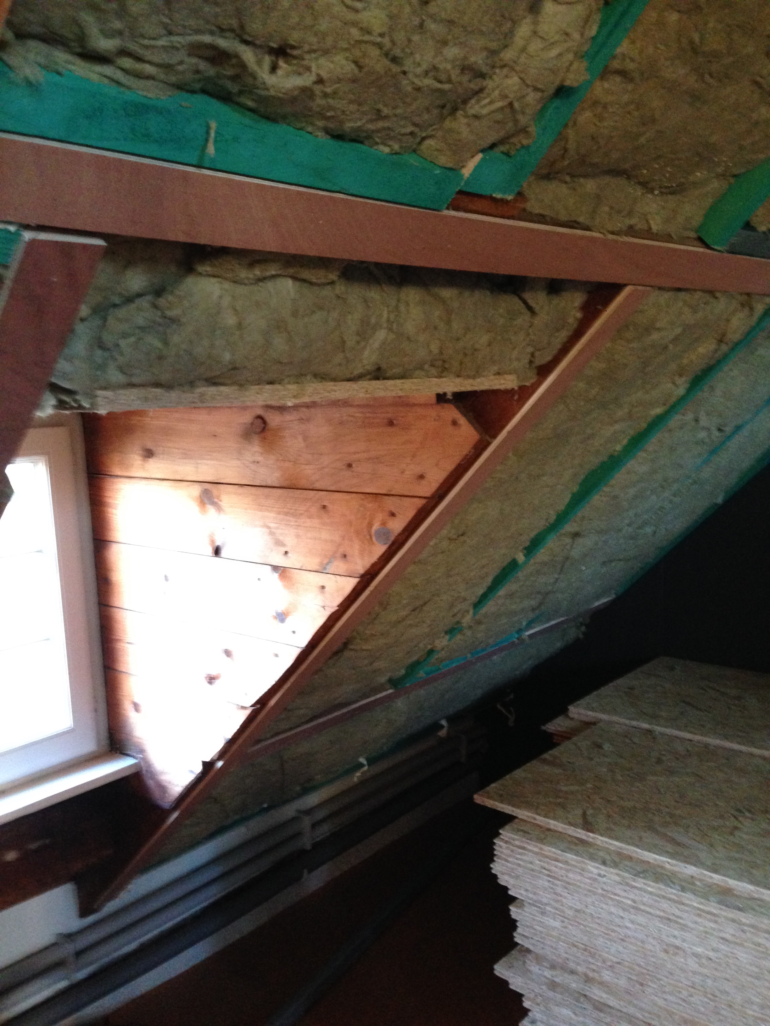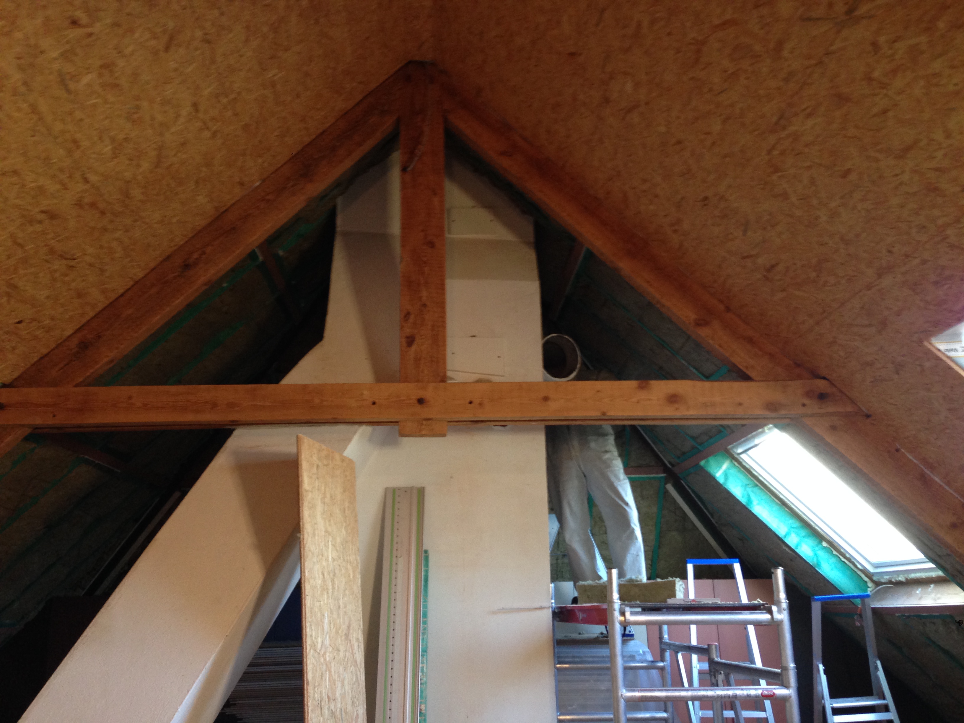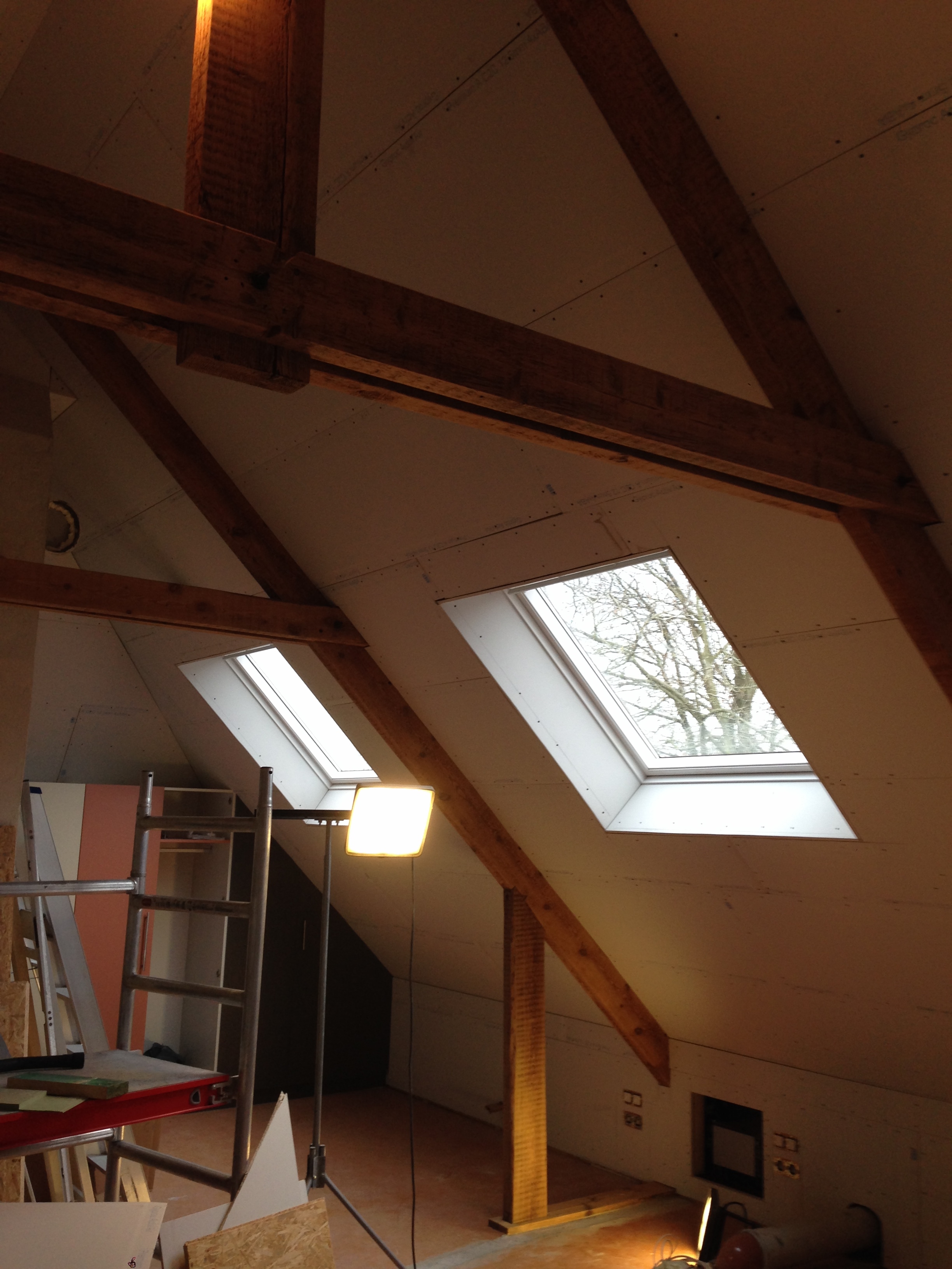Zolder langs binnen uit voorzien van extra spanten om de 18 cm dikke isolatie tussen te plaatsen.