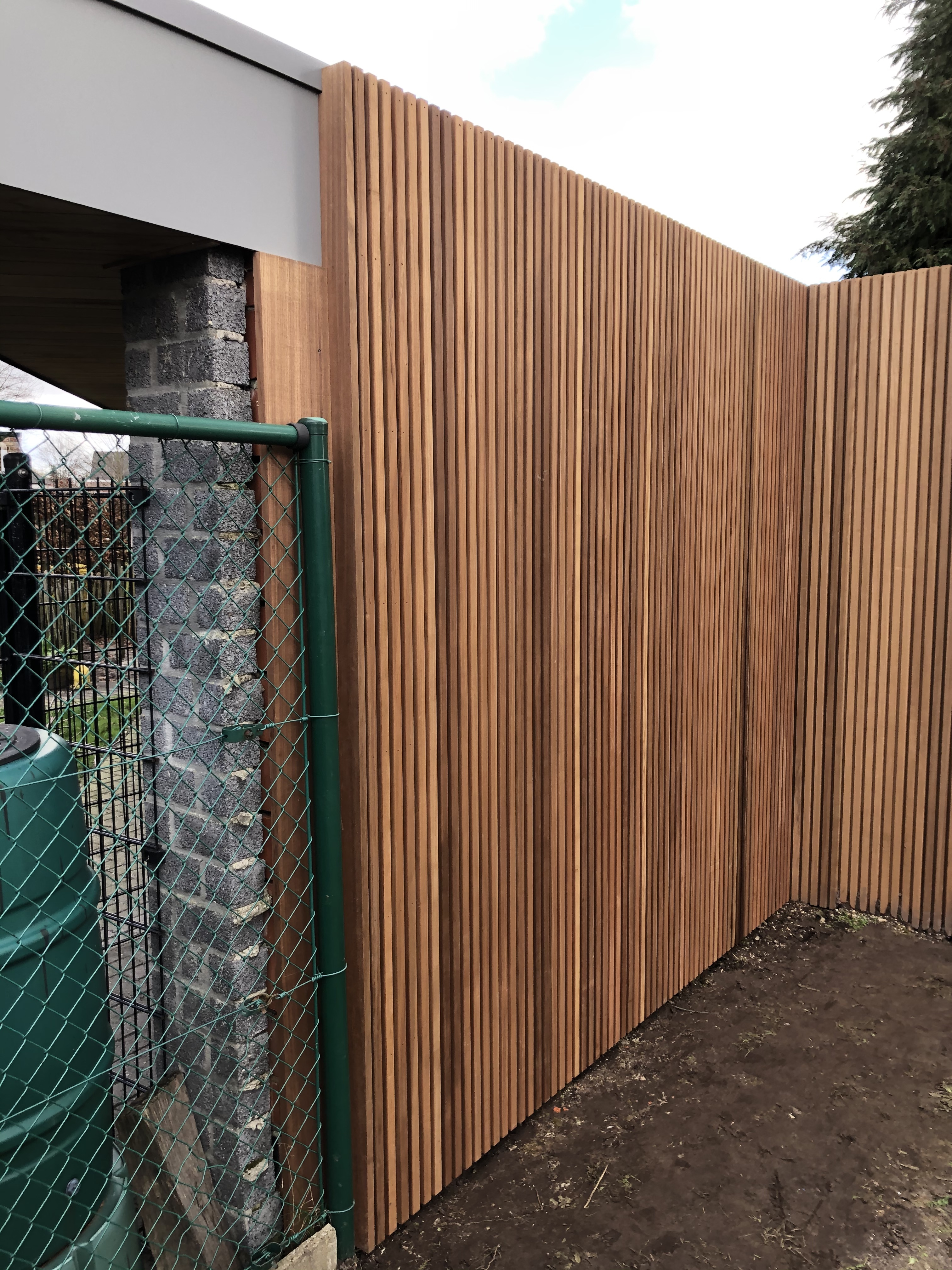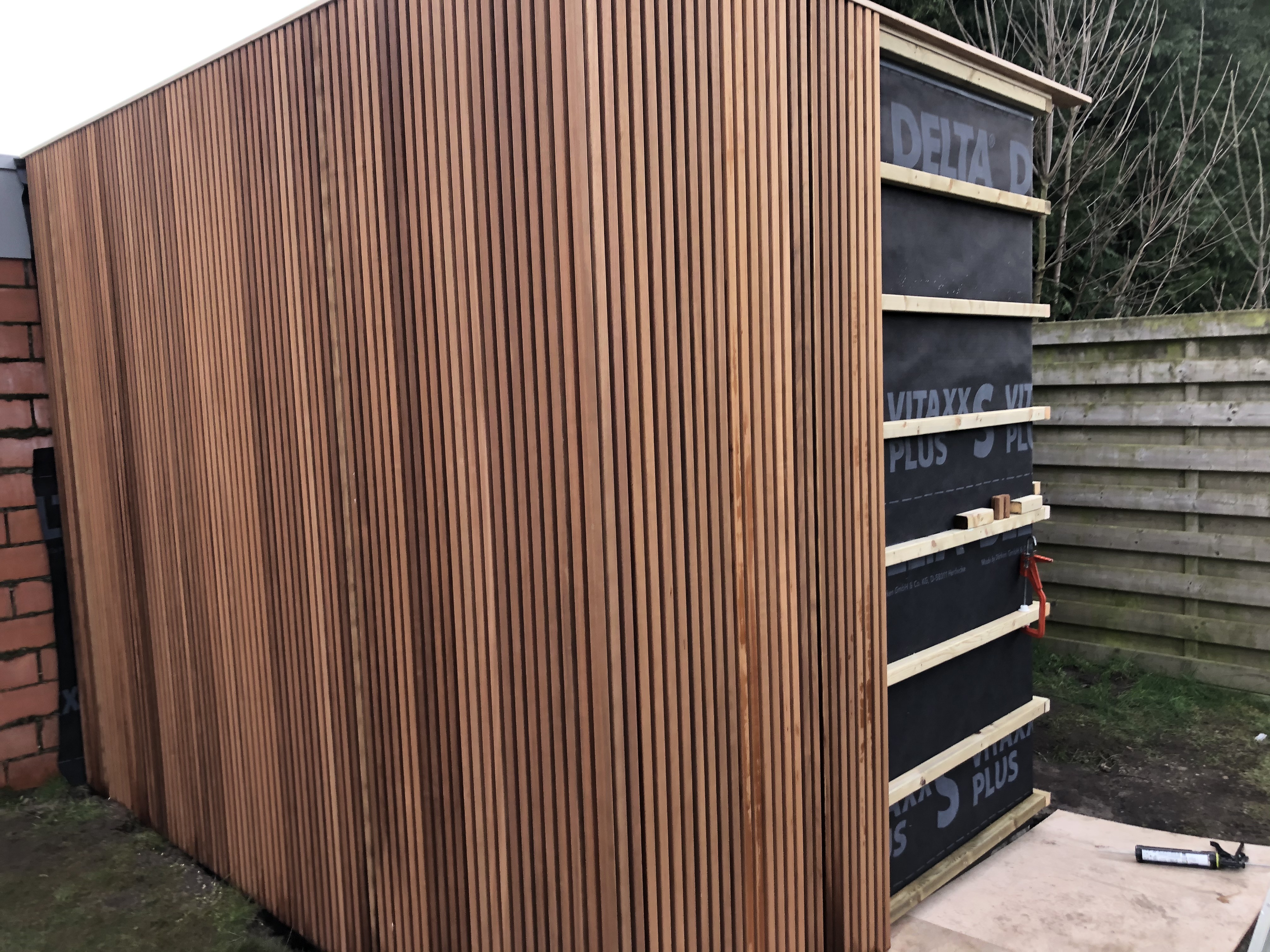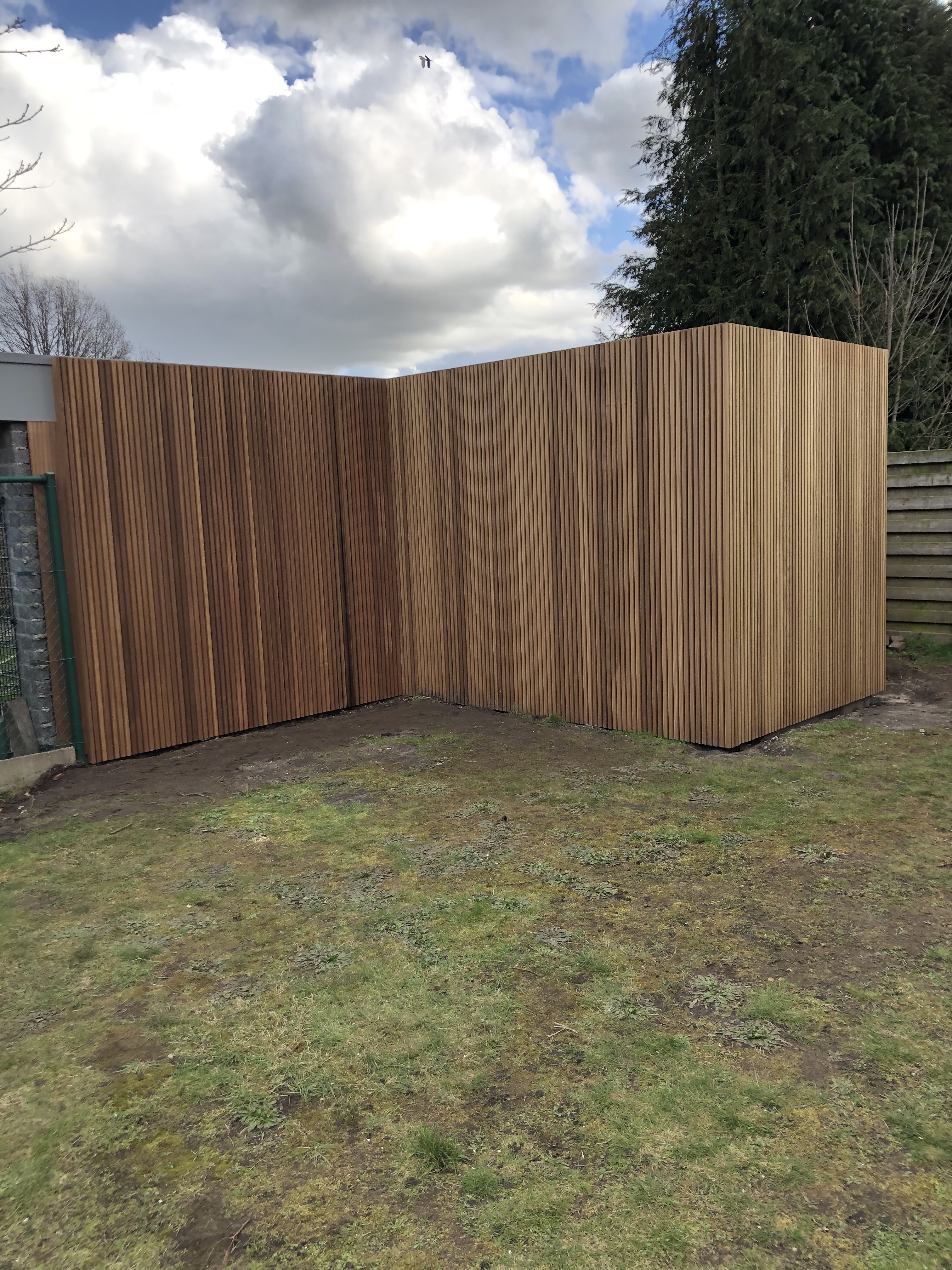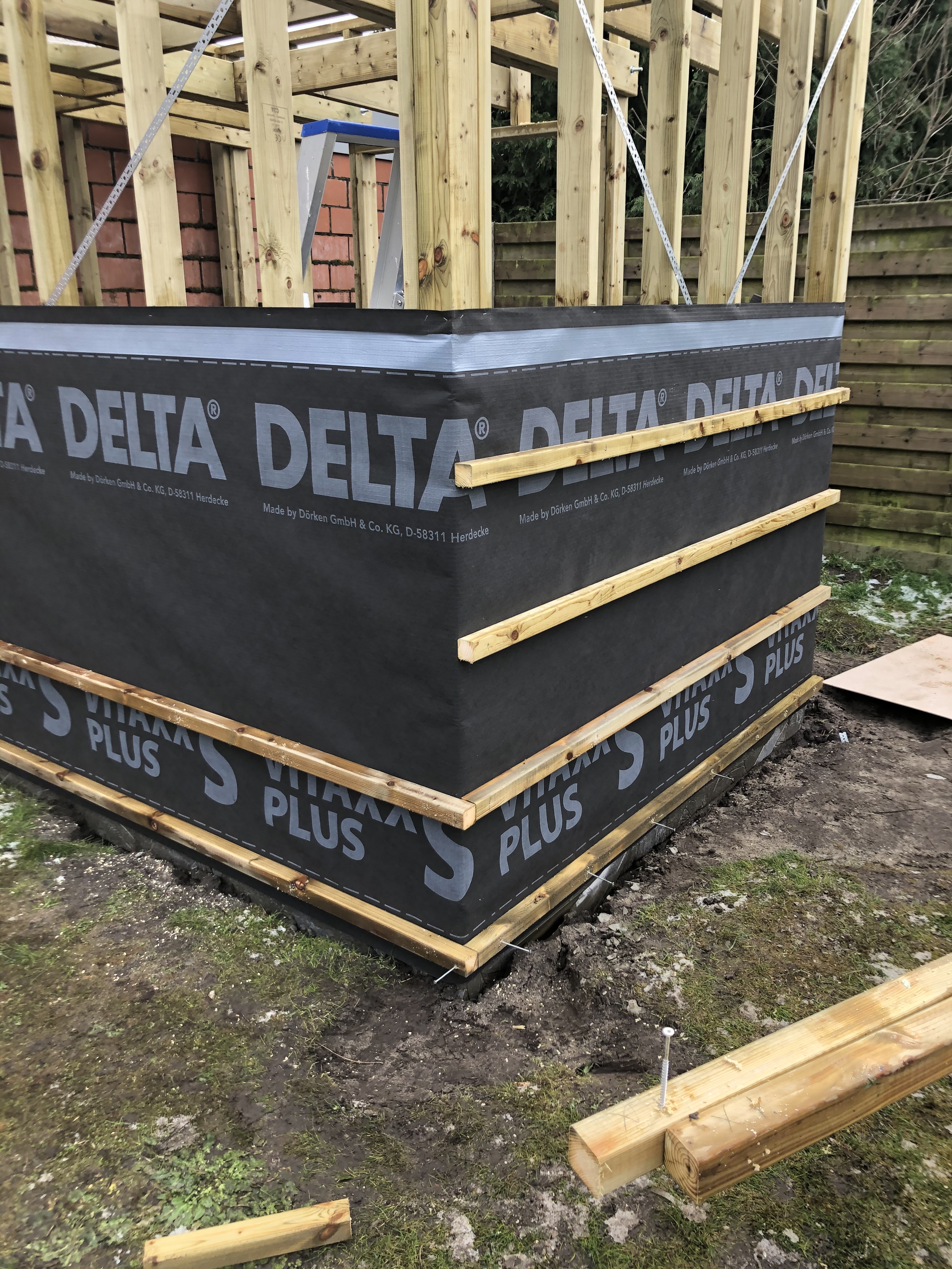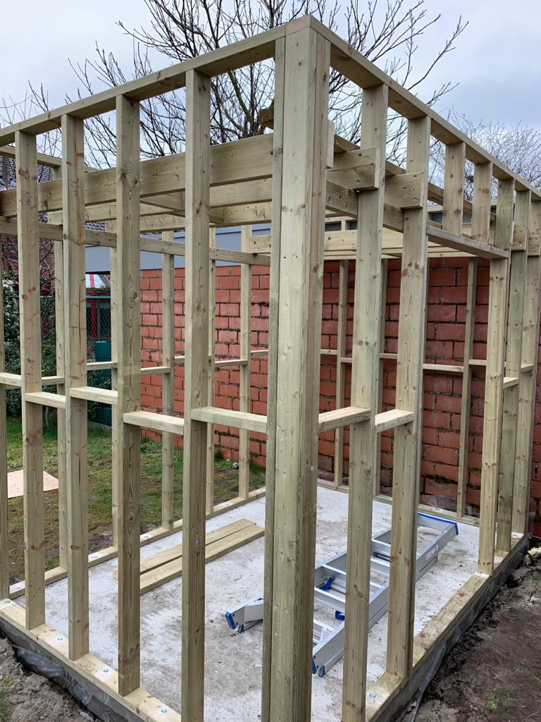 storten van nieuwe beton en optrekken van hout skelet voor nieuw tuinhuis, en wand.